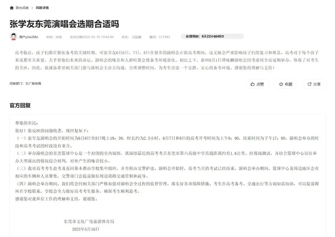 对于上述投诉,东莞市文化广电旅游体育局回复称:演唱会举办的时段和高考考试的时段没有重合;举办演唱会的东莞篮球中心是一个封闭的室内场馆,离场馆最近的高考考点东莞市第六高级中学直线距离约有1.6公里。经现场测试,并结合篮球中心以往举办大型演出的情况综合研判,对外产生的噪音较小。