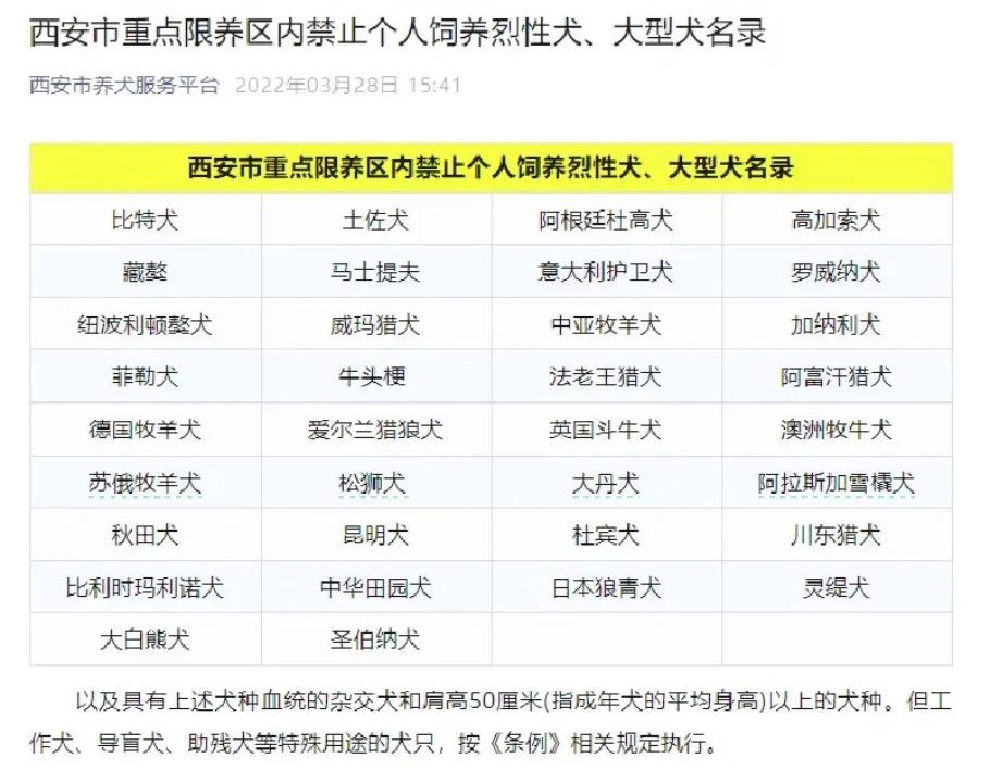 一张网传陕西省西安市公安局限制养犬管理办公室发布的“重点限养区禁止饲养烈性犬和大型犬”图片引发热议,其中“中华田园犬”的列入让不少网友感到意外。