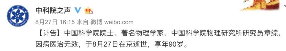 8月27日,中国科学院院士、著名物理学家、中国科学院物理研究所研究员章综,因病医治无效,在北京逝世,享年90岁。