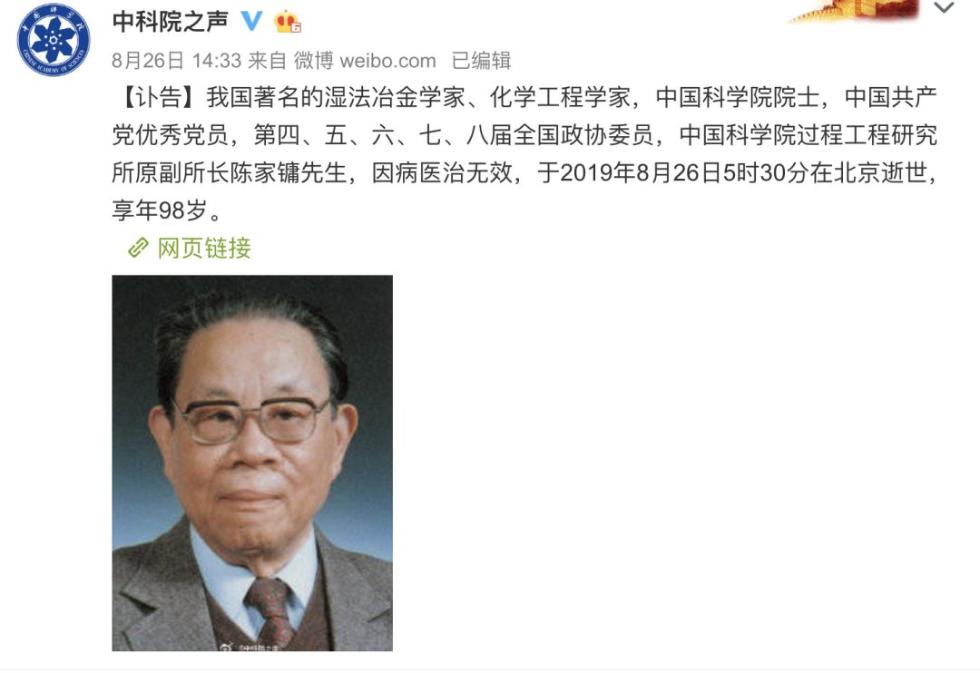 就在前一天,8月26日,中国化学工程专家,首批博士生导师之一,中国科学院院士陈家镛,在北京因病逝世,享年98岁。