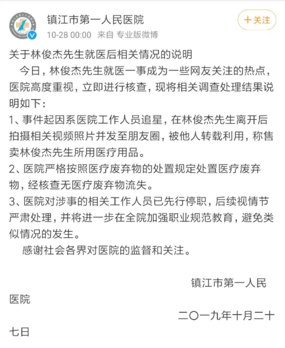 此前,针对此事,江苏镇江市第一人民医院也发布声明称,该事系医院工作人员追星,拍摄林俊杰就医后的医疗废弃物视频、照片并发至朋友圈,被他人转载利用,称售卖林俊杰所用医疗用品。目前,涉事工作人员已被停职。