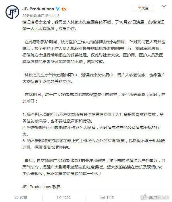 此事一经曝光,迅速引发舆论关注,截至发稿,微博相关话题阅读已达2.8亿。认证为“林俊杰官方歌迷会”的微博用户发布声明,证实林俊杰27日上午因感不适前去镇江市第一人民医院就诊。