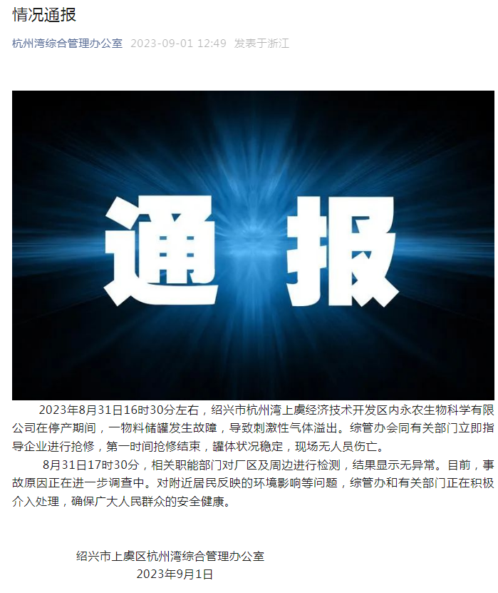 2023年8月31日16时30分左右,绍兴市杭州湾上虞经济技术开发区内永农生物科学有限公司在停产期间,一物料储罐发生故障,导致刺激性气体溢出。综管办会同有关部门立即指导企业进行抢修,第一时间抢修结束,罐体状况稳定,现场无人员伤亡。