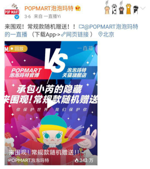POP MART泡泡玛特推出了多样化的直播活动为消费者们带来乐趣,实现线上吸引客流,刺激潮玩的消费。如在女王节活动期间,POP MART泡泡玛特官方微博和天猫旗舰店以直播进行PK竞赛,为粉丝们送上惊喜好礼并将拆出的隐藏款潮玩送给前线医护人员,累计观看人次达338.4万,以独居匠心的方式吸引客流并传递了爱心。再比如POP MART泡泡玛特还推出了邀请网络红人@王豆豆爱逗逗儿在抖音直播到店拆潮玩盲盒的活动,近日的一场直播达成了31.9w的观看人次,增强了客户对潮玩盲盒的消费意愿。