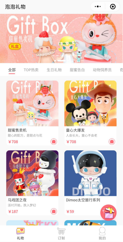 以泡泡礼物为例,小程序主打“甜蜜售卖机”、“童心大爆发”、“马戏团之夜”等一次性收获不同系列作品的潮玩礼盒,主要针对有“礼物”需求的群体。在情人节前期,泡泡礼物则推出了情人节专属告白礼盒,成功抓住情人节礼物销售旺季红利,有力推动潮玩的消费。