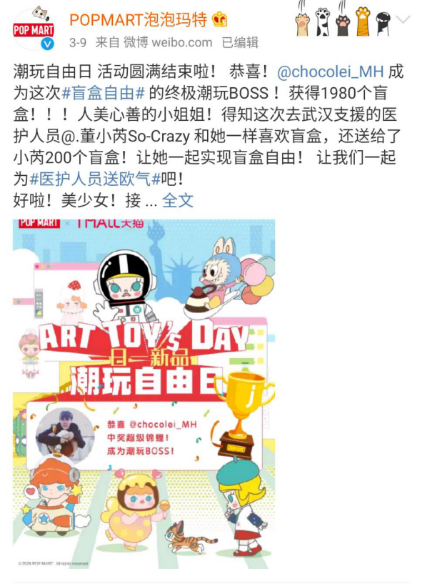 此外司德在还采访中介绍道,POP MART泡泡玛特也加大了在抖音、B站、小红书、微信、微博等社交网络、社交媒体的人力、物力投入,通过宣传防疫知识,在帮助品牌触达消费者的同时,也实现对消费者的人文关怀。