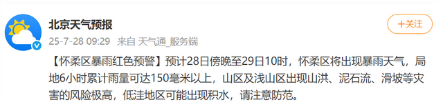 【怀柔区暴雨红色预警】预计28日傍晚至29日10时,怀柔区将出现暴雨天气,局地6小时累计雨量可达150毫米以上,山区及浅山区出现山洪、泥石流、滑坡等灾害的风险极高,低洼地区可能出现积水,请注意防范。