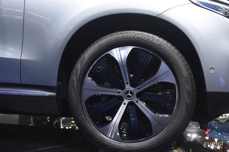 EQC 350使用了一套全新的轮毂造型,采用亮银、亮黑以及蓝色饰条的多元素搭配,与EQC 400的AMG风格相比,与整车调性更搭,也更符合新能源身份。