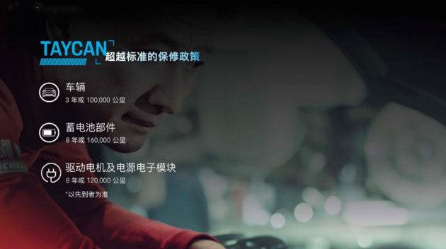 Taycan提供3年或者10万公里的整车质保,蓄电池部分为8年16万公里质保,驱动电机以及电源电子模块提供8年或者12万公里质保。