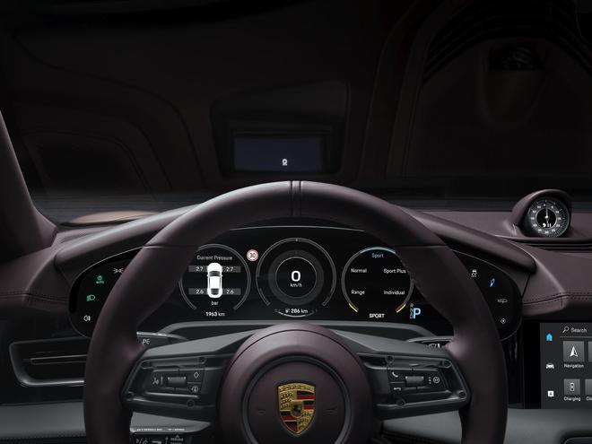 内饰方面,保时捷Taycan与保时捷Mission E概念车基本保持一致,以“以驾驶者为中心”的设计理念,仪表盘高于中控台,保时捷Taycan仪表盘采用一块16.8英寸曲面屏,并具备4种显示模式(经典模式、地图模式、全地图模式以及纯净模式)。