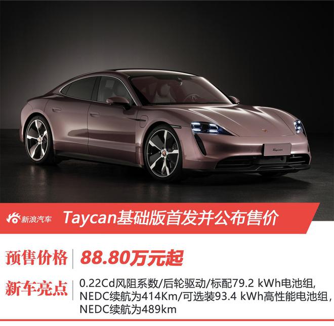 新浪汽车讯 2020年6月29日晚,保时捷发布了Taycan base(Taycan基础版)车型,新车将作为Taycan系列的入门版本,该车将采用后轮驱动形式,0-100km/h加速时间为5.4s。电池方面,提供两种蓄电池。标配一块容量为79.2 kWh的单层标准电池,NEDC续航为414km;还可选装容量为93.4 kWh的双层高性电池,NEDC续航为489km。新车目前已经开始预售,新车的售价为88.80万元起。