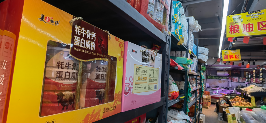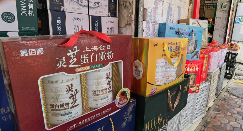 记者粗略统计了一下,这些店铺里的“蛋白质粉”产品名称有:中老年加钙蛋白质粉、牦牛骨钙蛋白质粉、无加蔗糖蛋白质粉、高钙蛋白质粉、益生菌高钙驼乳蛋白质粉、阿胶多肽蛋白质粉、中老年益生菌蛋白质粉、海参肽高钙蛋白质粉、灵芝蛋白质粉、人参营养蛋白质粉等。