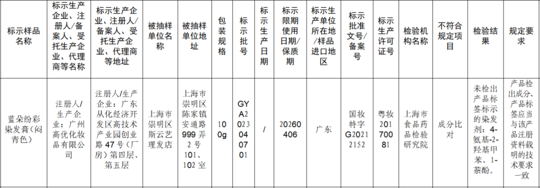 标称广州高优化妆品有限公司生产的“蓝朵纷彩染发膏(闷青色)”未检出产品标签标示的染发剂:4-氨基-2-羟基甲苯、1-萘酚。