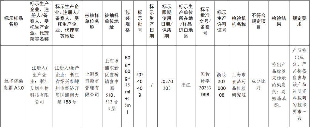 标称浙江艾妍生物科技有限公司生产的“丝华诺染发霜A3.0”则检出产品标签未标示的染发剂:对氨基苯酚。