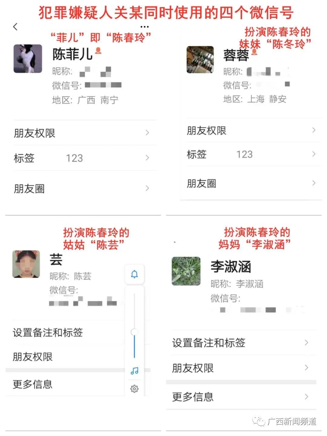 在2020年7月至10月之间,陈先生与关某频繁聊天,经常转几百元钱给关某。2020年10月,关某以“菲儿”的身份与陈先生确立男女朋友关系之后,其利用多个微信号扮演陈先生的女朋友“陈春玲”、陈春玲妹妹“陈冬玲”、陈春玲姑姑“陈芸”、陈春玲的妈妈"李淑涵"等四个角色来获取陈先生的信任。