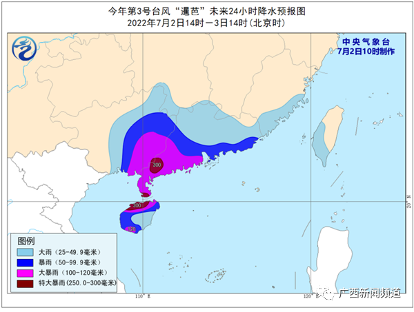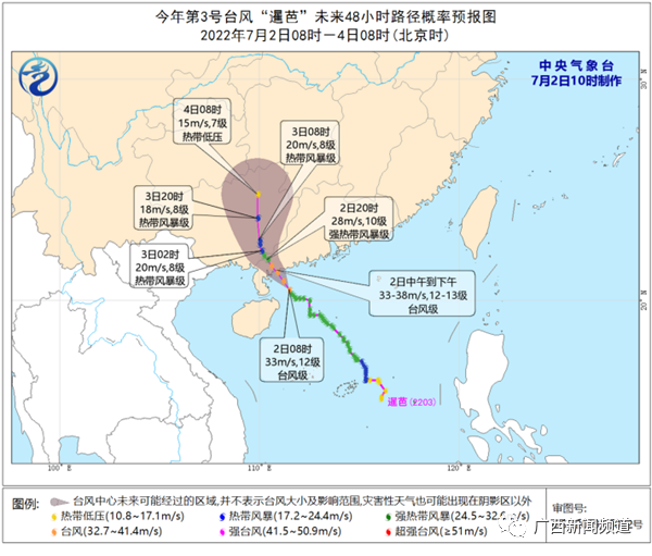 广西气象台首席预报员 赵金彪: 这个台风现在从目前的结构来看是非常完整,而且个体相对比较大,我们预计这个台风进入桂东南以后的强度还是维持这个强热带风暴量级,然后它继续向西偏北方向移动,可能4日以后它会深入到广西的中部。