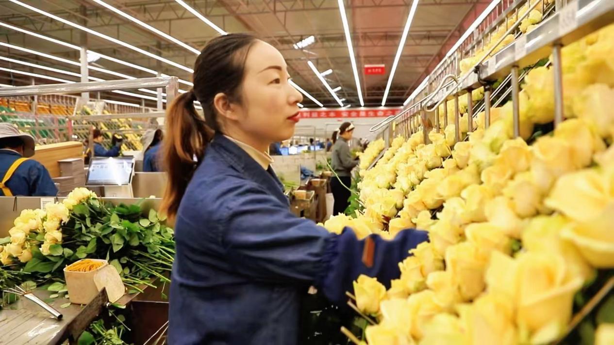 基地里,玫瑰以每40天一茬的速度茁壮生长,日产鲜切花达20万枝。企业提供了超过500个就业岗位,不仅吸引本村村民,还有很多来自周边县区的务工者。许多像婷婷一样的女工,在这里找到了人生第一份工作。