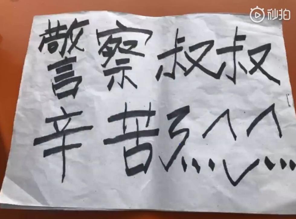 一个写着“警察叔叔辛苦了...^_^...”的纸条,