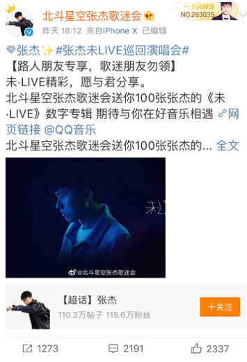 昨日下午,张杰官方粉丝后援会“北斗星空张杰歌迷会”发布了一条微博,“未·LIVE精彩,愿与君分享”,意指要免费送出100张数字专辑。消息一出,瞬间引来粉丝们的关注,纷纷在评论区留言指路,并呼吁路人们多来围观此次活动。官方歌迷会这一举动不仅得到了粉丝们的高度认可,也成功使张杰本身就很好的路人缘再次翻升了好几倍!