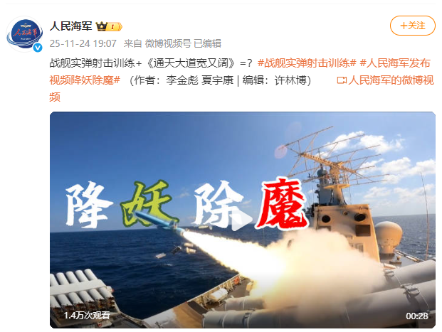 战舰实弹射击训练+《通天大道宽又阔》=?人民海军发视频降妖除魔。