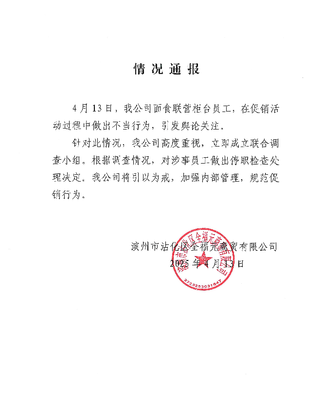 4月14日凌晨,全福元超市沾化店发布《情况通报》:面食联营柜台员工在促销活动过程中做出不当行为,对涉事员工做出停职检查处理决定。