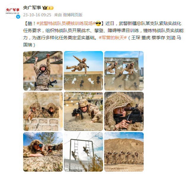 近日,武警新疆总队某支队紧贴实战化任务要求,组织特战队员开展战术、攀登、障碍等课目训练,锤炼特战队员实战能力,为遂行多样化任务奠定坚实基础。(王琛 董虎 蔡季存 刘涵 马国瑞)
