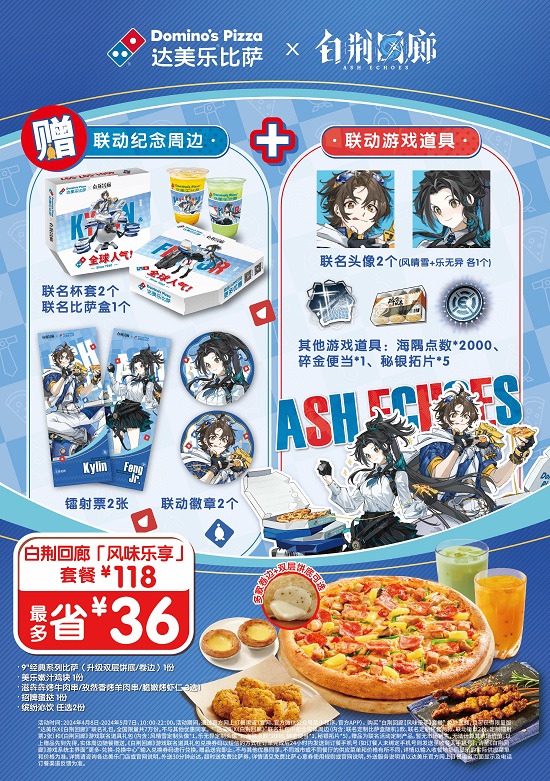 美乐相伴,风味速达!全球人气比萨品牌达美乐比萨宣布携手高人气即时多维战斗RPG游戏《白荆回廊》开展跨界联动合作,共同推出包括定制套餐、包材、周边、主题店等一系列联名活动,为玩家群体开启“异世二次元时空”限时美味交汇之旅!联动期间即2024年4月8日至5月7日,达美乐比萨中国于全国指定门店*推出联名限定套餐——“白荆回廊【风味乐享】套餐”,粉丝们可通过官方线上订餐渠道*购买套餐,最高劲省36元,并随餐赠送精美定制游戏周边产品,全国限量7万份,先到先得,送完即止!4月8日起,还有全国12家达美乐x《白荆回廊》线下联动主题门店*闪亮换装登场,特色主题活动值得粉丝们期待!快来与《白荆回廊》新篇章人气角色“风晴雪”&“乐无异”一起开启这场美味盛宴吧!