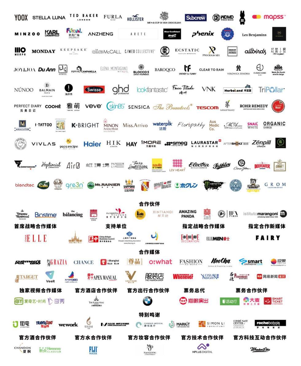 YOOX、STELLA LUNA、TED BAKER、FURLA、BALMAIN HAIR巴尔曼美发、HOLLISTER、WDMD、PARTY RABBIT、mapss、Me & a CUP Of HOt CHOCOLate、allbirds、Growup、Subcrew、MINZOO、KARL LAGERFELD、SHIMAO FESTIVAL CITY世茂广场、ANZHENG、ARETE、Blue-Confidant & Morgan's、菲尼克斯phenix、Sundrine、Les Benjamins、MONOLOGUE、MORPH魔肤、MONDAY、KEEPSAKE THE LABEL、Alice McCALL、C/MEO COLLECTIVE、笙生、ECSTATIC、Precious · Xin、House of Avenues、红鼓小爱、JOY&JOA、Du Ann、山后SUNHOL、PEPPINO CAMPANELLA、ELENA MONTAGANO、Blocco 5、BAROQCO、TRENDY&FUNNY、Clear to rain、VERONICA ZENOBIA薇泽定制、movo gelato、Walk On Earth Anello Largo、Núnoo、海菲秀、Swisse、ghd、Lookfantastic、瞳昕FaceTitude、VNK、HerbaLand禾宝蓝、Tripollar、完美日记、COOHé、雅萌、veve、SkinB5、SENSICA、Rohr Remedy、The Beautools、TESCOM、GL Natural Beauty、Naked Bean、MIRACLETOX、I-TATTOO、Aromababy、K-BRIGHT、MINON、Miss. Arrivo、waterpik洁碧、Floropathy、Aus Medic Co、MEIP EXECUTIVE CLASS、Organic Choice、NICOLAI、VIVLAS、papa recipe春雨、海尔、HAY、1MORE万魔耳机、smeg、LAURASTAR、AfterShokz韶音、zēnpill、answer Lounge、3TC by 3omethingchic、HOPTIMIST、Air0、纸现场、This is a Limited Edition、Savills、LIV HEART、ELECTRA、Pashley、5J Cinco Jotas、Beefeater、Slitti、Blendtec、Eulla、gre3n Thai coconut brand、Mt.RAINIER漫芮怡、SAPPORO日本三宝乐啤酒、C.V.N.E、HOKUREN北连大米、SPACE SNACK、Monster Energy、周黑鸭、GROM、MC CANN’S、snail white、EAC法国艺术文化管理学院