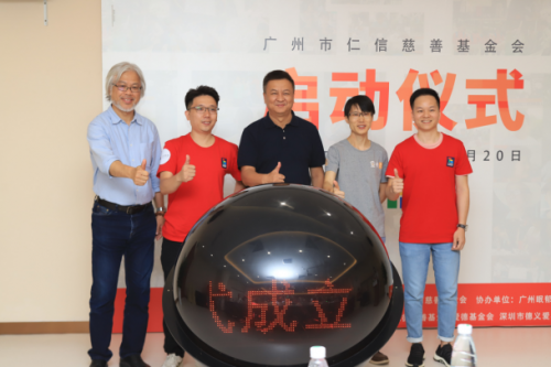 ▲与会嘉宾共同点亮启动球,从左到右依次为:英飞尼迪集团投资总监、仁德慈善基金董事赵炜强,广州市仁信慈善基金会理事长李博,中国社会工作联合会总干事林平光,广东灵机文化传播有限公司副总裁崔智聪以及广州市仁信慈善基金副理事长刘兴东