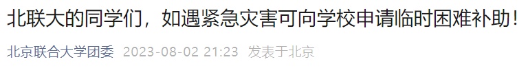 近日受超强台风“杜苏芮”影响,多地出现强降雨天气,部分地区汛情严重,造成大量人员伤亡和财产损失。牵动着每一个人的心,多所北京高校相继发声:受灾学生可向学校申请补助。