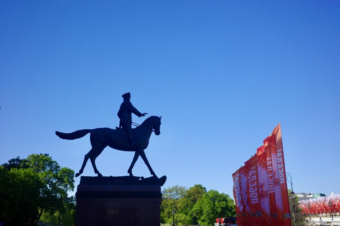 当地时间5月6日,朱可夫元帅雕塑。这一形象原型来自1945年的胜利日阅兵,当时朱可夫骑马行进在红场。 刘少华 摄