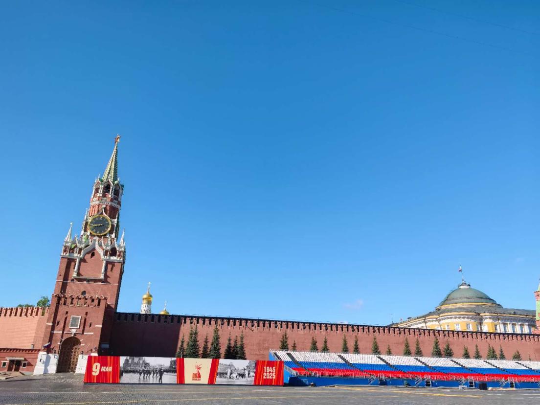 当地时间5月6日,位于莫斯科红场的圣瓦西里教堂前,已经布置好了纪念苏联伟大卫国战争胜利80周年庆典的展板。 刘少华、李建广 摄