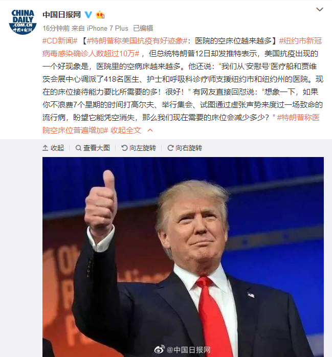 【#特朗普称美国抗疫有好迹象#:医院的空床位越来越多】#纽约市新冠病毒感染确诊人数超过10万# ,但总统特朗普12日却发推特表示,美国抗疫出现的一个好现象是,医院里的空病床越来越多。他还说:“我们从‘安慰号’医疗船和贾维茨会展中心调派了418名医生、护士和呼吸科诊疗师支援纽约市和纽约州的医院。现在的床位接待能力要比所需要的多!很好!” 有网友直接回怼说:“想象一下,如果你不浪费7个星期的时间打高尔夫、举行集会、试图通过虚张声势来度过一场致命的流行病,盼望它能凭空消失,那么我们现在需要的床位会减少多少?”