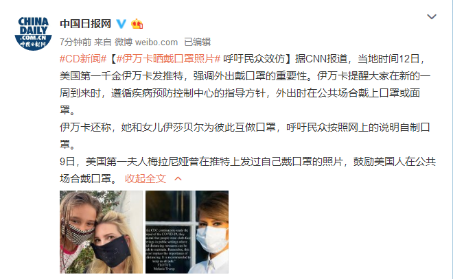 【#伊万卡晒戴口罩照片# 呼吁民众效仿】据CNN报道,当地时间12日,美国第一千金伊万卡发推特,强调外出戴口罩的重要性。伊万卡提醒大家在新的一周到来时,遵循疾病预防控制中心的指导方针,外出时在公共场合戴上口罩或面罩。