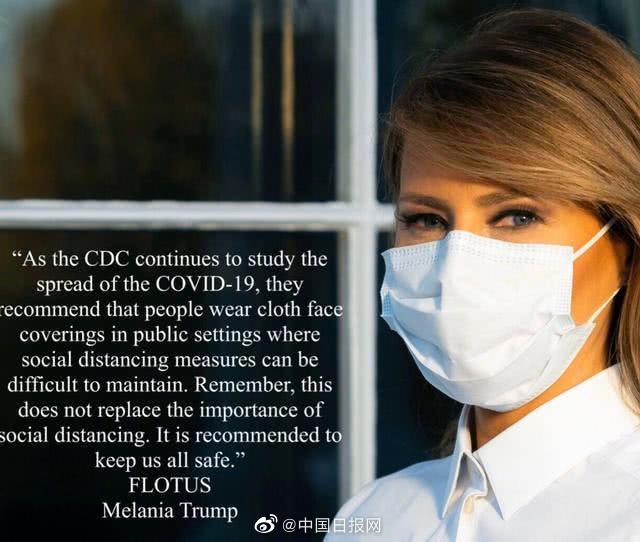 9日,美国第一夫人梅拉尼娅曾在推特上发过自己戴口罩的照片,鼓励美国人在公共场合戴口罩。