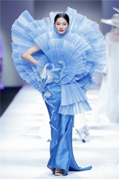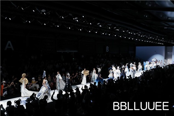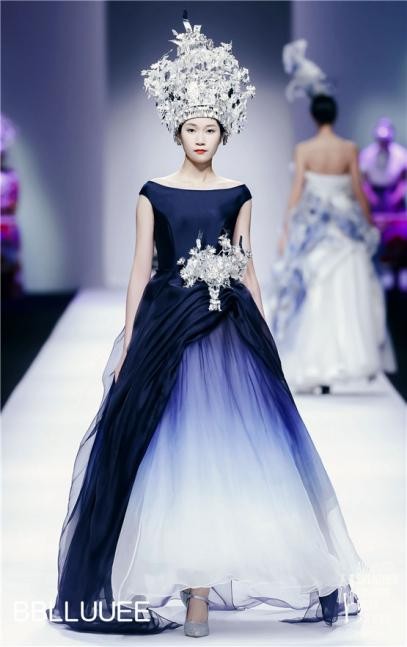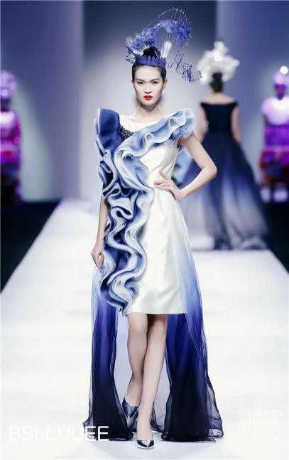 BBLLUUEE粉蓝时尚艺术跨界秀里,最亮眼的当属标志性蓝色系列礼服。泼墨般晕染开的蓝,在层层叠叠的褶裥裙里翻飞。让人当场想写一首赞美蓝色的诗,然而终究是衣服太惊艳,所有词语都显得苍白。
