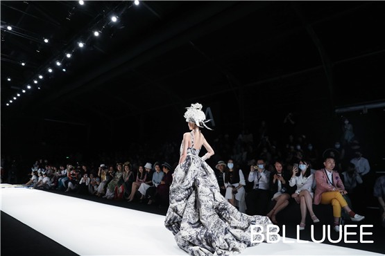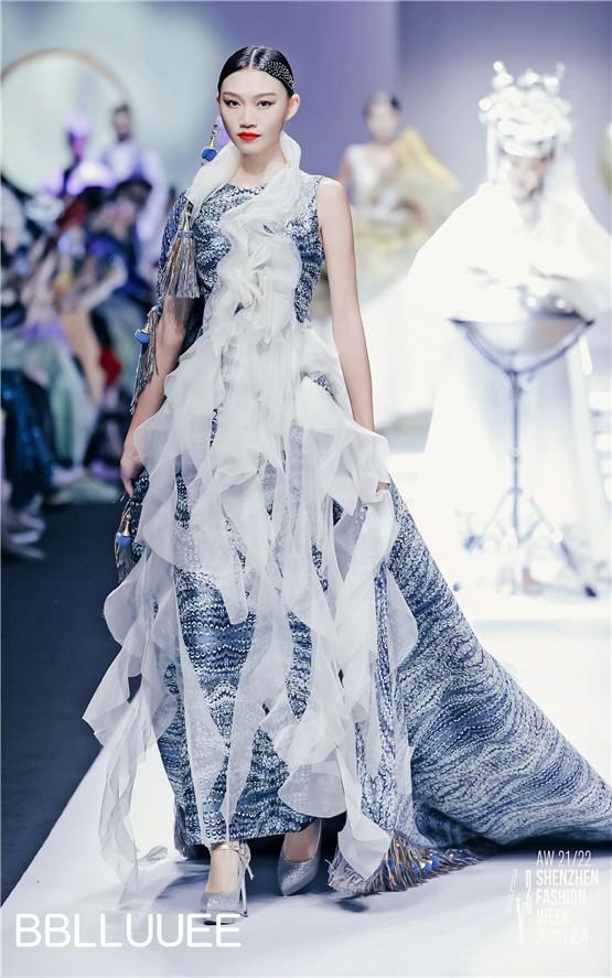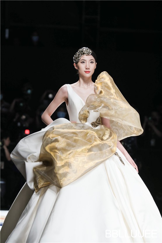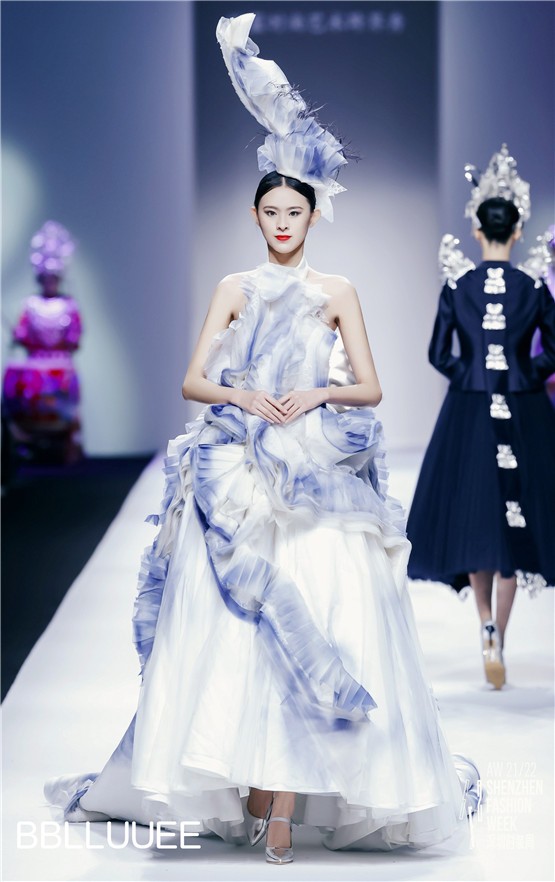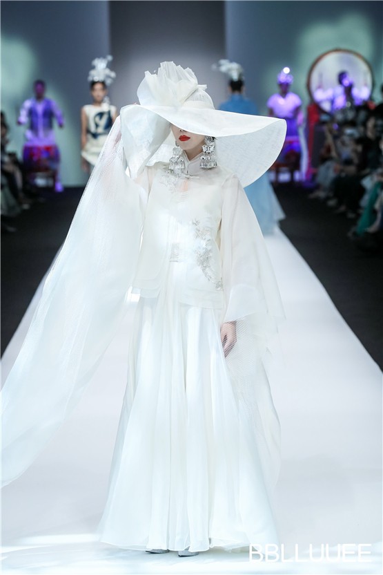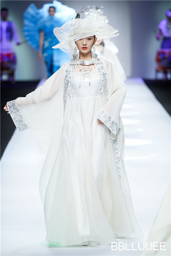 BBLLUUEE粉蓝时尚艺术跨界秀《日出苗岭》系列的白色系列礼服,撷取传统汉服元素,薄纱袅袅,穿在身上,就像打了高光,整个人会显得细腻而干净。