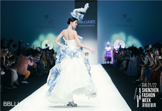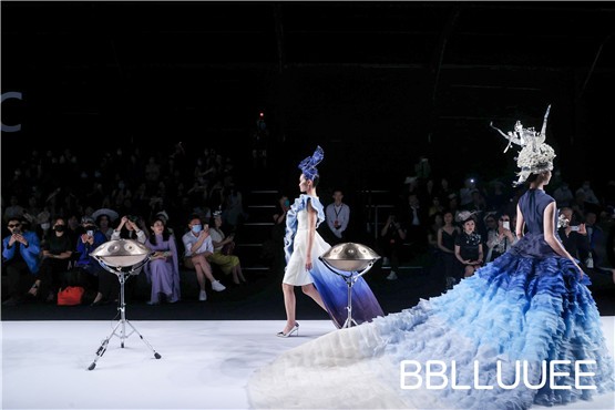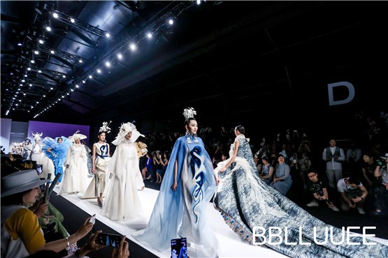 BBLLUUEE粉蓝时尚艺术跨界秀《墨染山林》系列的蓝色深邃、高贵而清冷,在人来人往中隔绝出一方辽远的清静。往蓝色深处走,看到的是圣洁而高级的白。