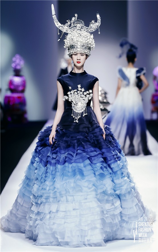 这几件礼服上面有明显的苗族图腾,幽蓝的印花在立体感裙型上热烈盛开。像那些在苗岭深处不甘平庸的姑娘,她们的美带着张扬而顽强的力量感,绚烂而精致,让人过目不忘。