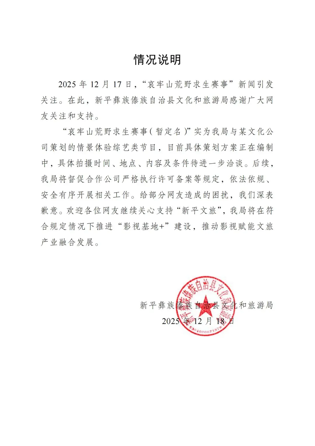 12月18日,新平彝族傣族自治县文化和旅游局发布一则情况说明: