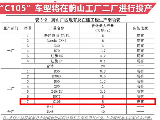 有媒体从一汽奔腾官方了解到:全新的“C105”车型将在位于吉林长春的蔚山工厂二工厂进行投产,该工厂年产能为20万辆,目前一汽轿车旗下的奔腾B50、奔腾X40、奔腾T77等车型均在此工厂进行生产。"C105"车型产能缩减40%给新特GA10系列产品(新特DEV 1),缩减后产能为3万辆。