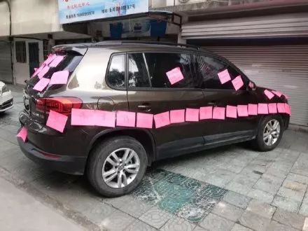 一辆私家车被贴满A4纸