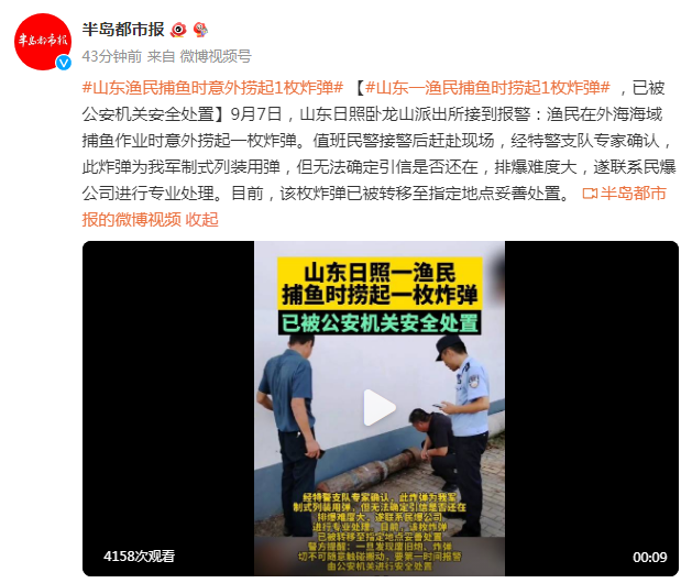 山东一渔民捕鱼时捞起1枚炸弹,已被公安机关安全处置