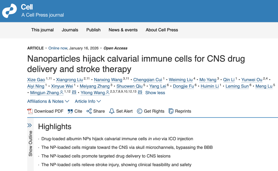 基于这一发现,研究团队采用颅骨骨髓微创注射方式,将白蛋白纳米颗粒直接送入颅骨骨髓腔内。实验结果显示,这些纳米颗粒可被颅骨骨髓免疫细胞高效摄取,形成“颅骨免疫细胞微纳机器人”。团队成员介绍道:“这并非传统意义上的‘机器人’,而是吞噬纳米颗粒后的免疫细胞。纳米颗粒本身没有靶向效果,被细胞吞噬后,就会被带着前往需要的地方,执行精确的药物递送。该给药方式体内系统暴露极低,纳米颗粒几乎不进入外周血液和主要脏器,也不会影响免疫细胞活力,具备良好的生物安全性。”