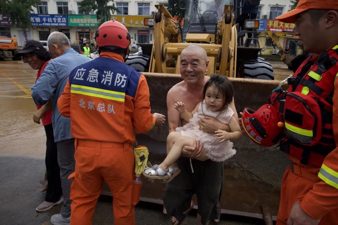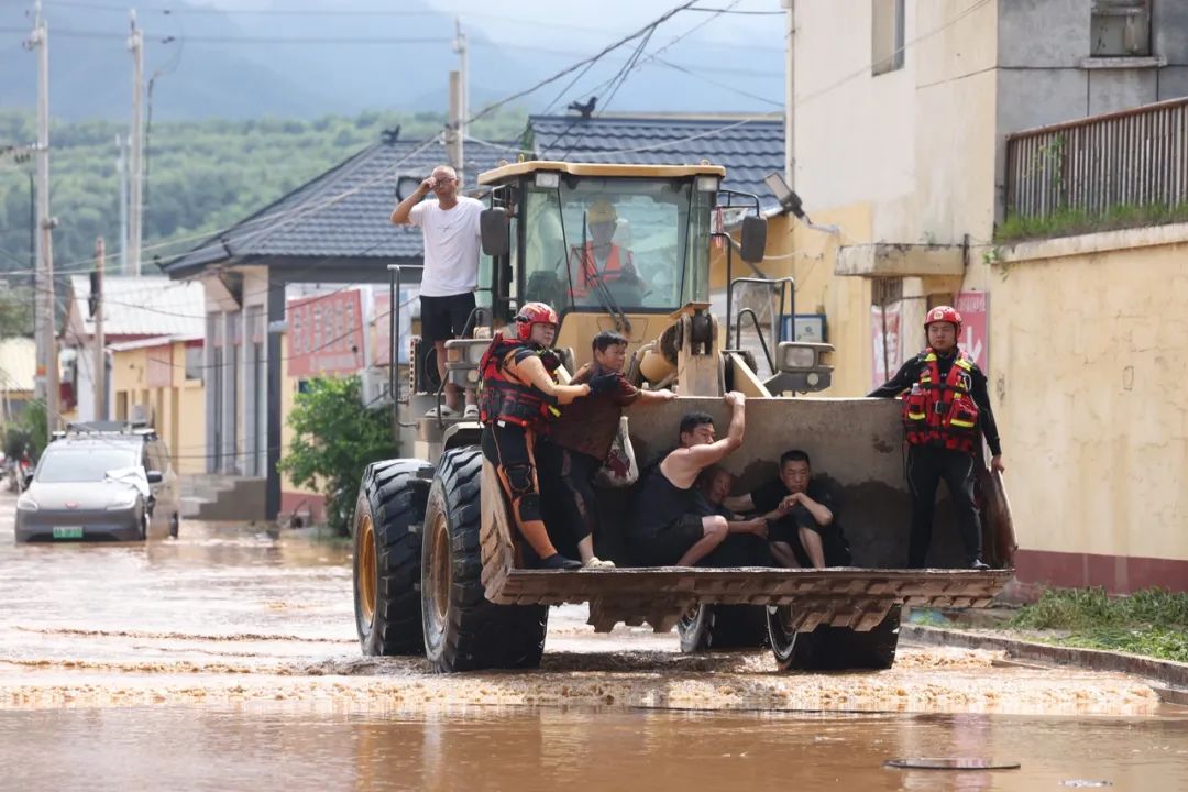 7月28日,北京市密云区太师屯镇葡萄园村,救援人员正用铲车转移群众。