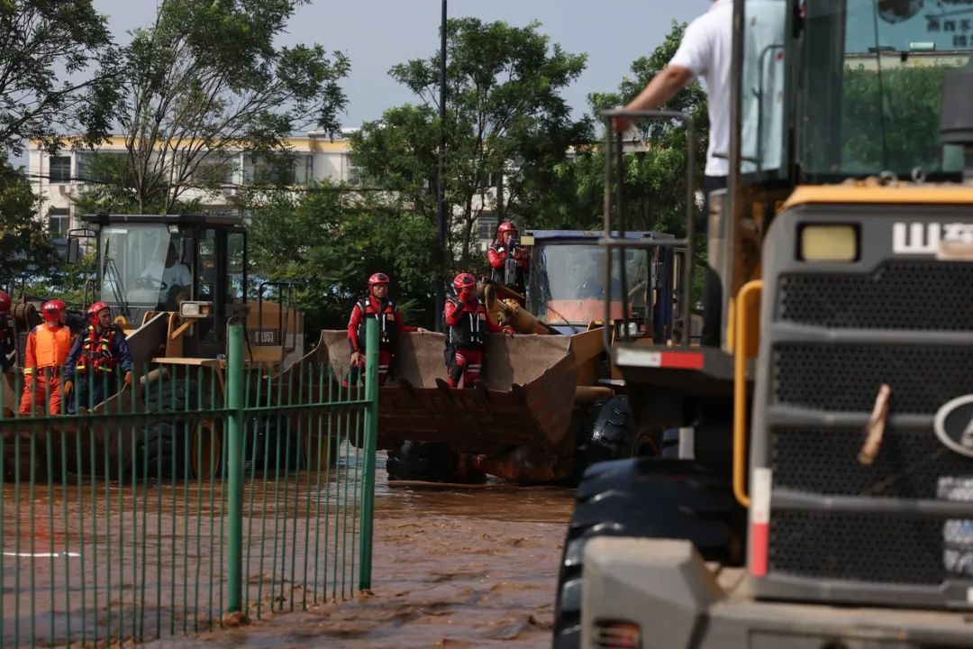 7月28日下午,工人日报记者在北京市密云区太师屯镇政府看到,救援人员正在使用工程车辆转移被困群众。