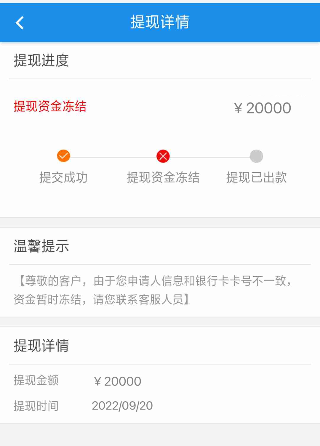 一番操作后,系统显示贷款成功,然而,贷款到账环节却出了岔子,弹出界面——提现资金冻结。