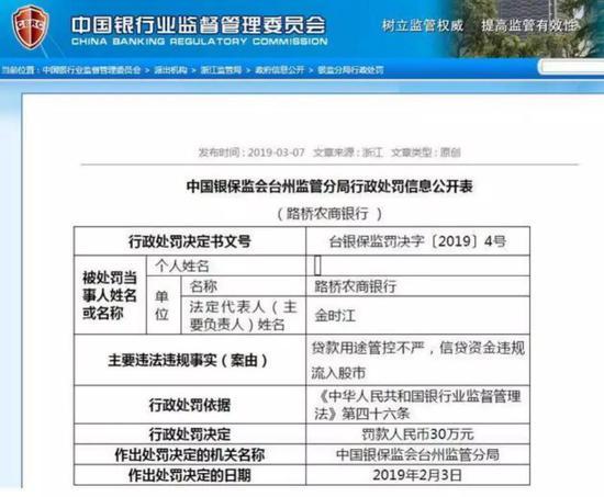 另据新华社客户端报道,原河南银监局去年2月9日开具的罚单显示,某银行郑州花园路支行因“信贷资金违规流入股市”被罚款50万元,相关负责人同样被追责。原天津银监局也针对辖区内银行分支机构“贷后管理失职,个人贷款被挪用于证券市场”的违规行为开出罚单,罚款金额为30万元。