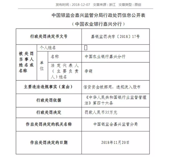 此外,还有信贷资金违规流入期货市场的。银保监会官网1月24日披露,交通银行嘉兴分行因信贷资金流入期货市场,被处罚30万元。