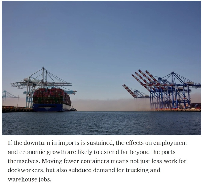 《纽约时报》相关报道分析指出,集装箱数量的减少不仅意味着码头工人的工作量减少,也意味着对卡车运输和仓库工作的需求会减少。如果进口量的下滑趋势持续,其对就业和经济增长的影响将远超对港口本身的影响。